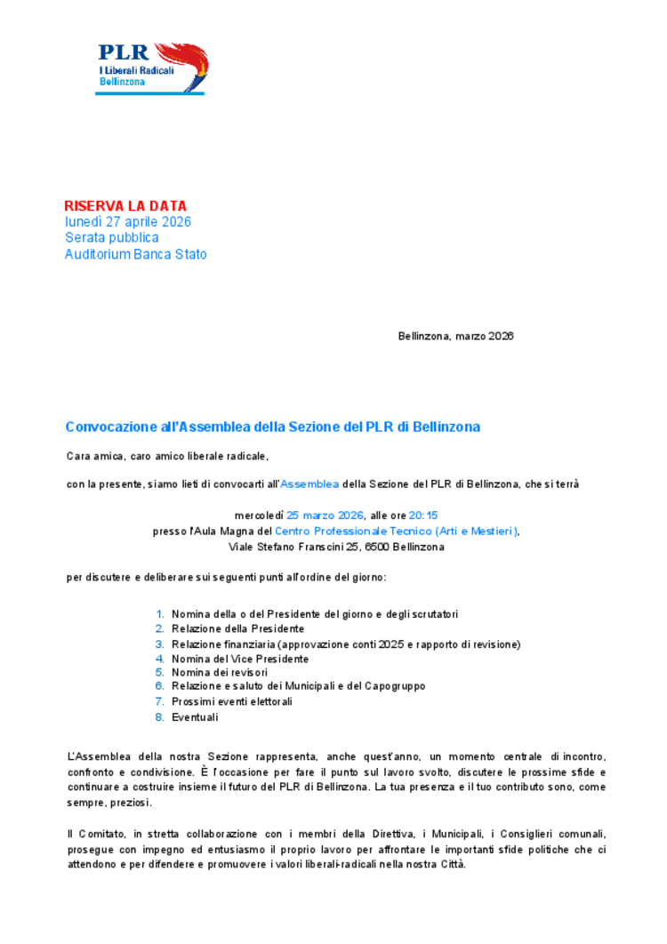 l’Assemblea generale PLR Bellinzona si terrà martedì 25 marzo 2026 alle ore 20.15, presso la Scuola Arti e Mestieri Bellinzona.