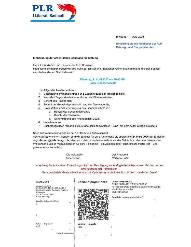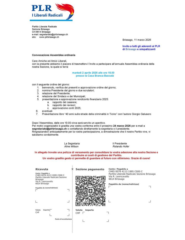 La Sezione PLR di Brissago informa che la prossima Assemblea ordinaria si terrà giovedì 2 aprile 2026 alle ore 18:00 presso la Casa Branca-Baccalà di Brissago.