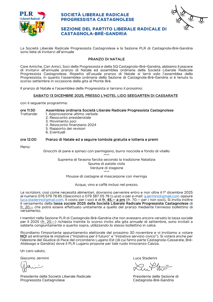 SQ Castagnola-Bré-Grandia e Società Liberale Radicale Progressista Castagnolese – Pranzo di Natale